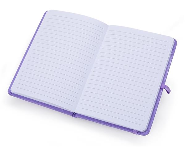 Caderneta emborrachada com suporte para caneta, elástico para lacre e marcador de página em cetim, contém aproximadamente 80 folhas com pauta na cor branca. Tamanho  17,7x12,5 cm